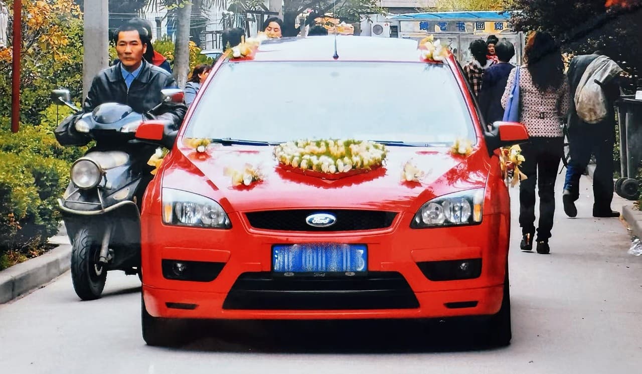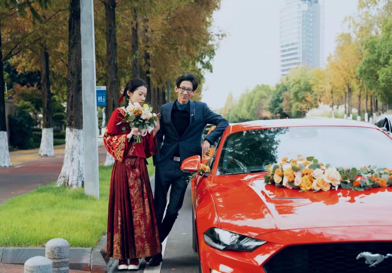 Though the car had recently been wrapped in a yellow color-change film, her sister insisted red was the only color for a Chinese wedding. Without hesitation, they peeled off the film, restoring its original vibrant hue.