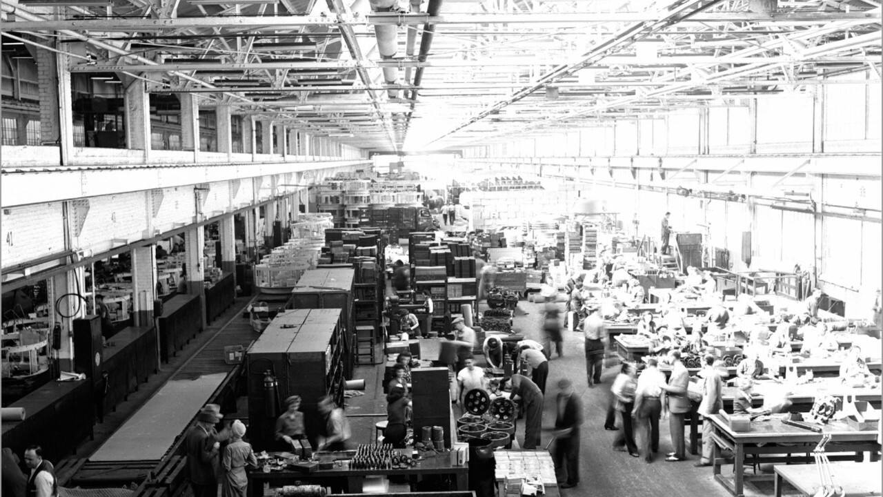 Ford occupied Detroit's Highland Park plant, also designed by Kahn, in 1910. This is the location where the moving assembly line was implemented, taking Model T production to its height of about 1,000 cars per day. Although it was dubbed the “Crystal Palace” for the sunlight that flooded the space on bright days, the facility used just a quarter of the glass that would go into the Glass House.