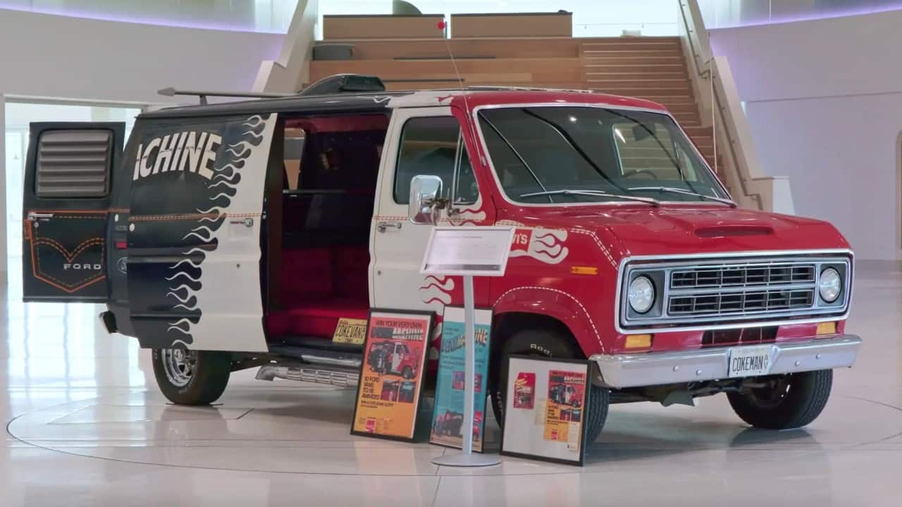 Designed by the editors of HOT ROD Magazine and built by Chicago-based Van Goodies, the red-white-and-blue, chrome-plated van featured distinctive Coca-Cola and Levi's-inspired elements inside and out.